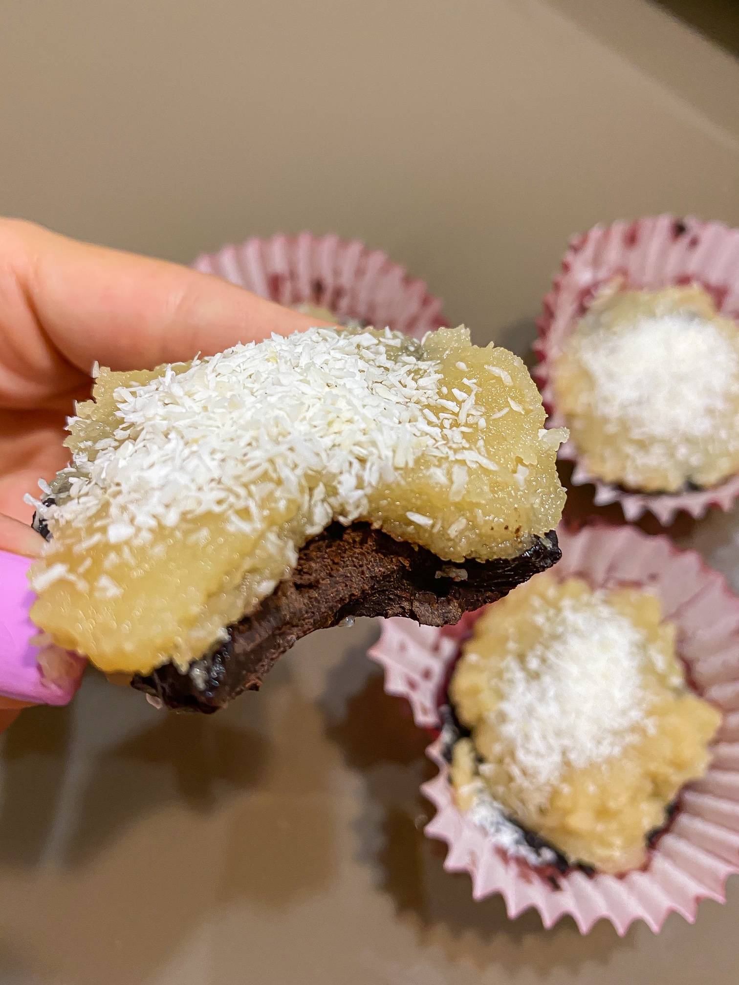 Hedhim në një tenxhere gjalpin e kakaos dhe e shkrijmë ne temperaturë të ulët. Shtojmë kakaon, ndërkohë që e përziejmë. Kur fillon e trashet masa, shtojmë mjaltin dhe vaniljen. Fikim zjarrin dhe e përziejmë edhe për pak sekonda. Masën e krijuar e ndajmë nëpër letra të vogla që shërbejnë për cupcake (që mund të jenë plastike, ose letre) dhe e fusim në ngrirje për 10 minuta. E nxjerrim dhe I shtojmë secilës sipër, gjalp kikiriku dhe arrën e kokosit. E fusim sërish në frigorifer për 10 minuta.