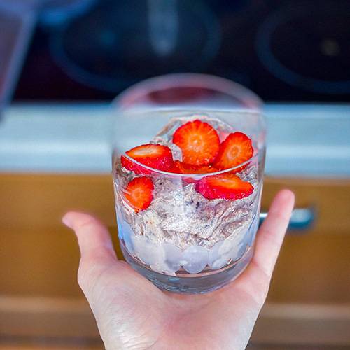 I perzieni te gjitha bashke mire e mire. E ndani neper gota dhe i hidhni luleshtrydhe siper. E fusni ne frigorifer per 10-15 minuta.