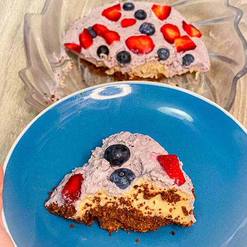 I Hedhim gjithe perberesit ne blender. I leme per disa minuta derisa te behet nje mase kremoze. Masen e perfituar e vendosim siper dy shtresave te tjera. E zbukurojme siper me boronica dhe luleshtrydhe.